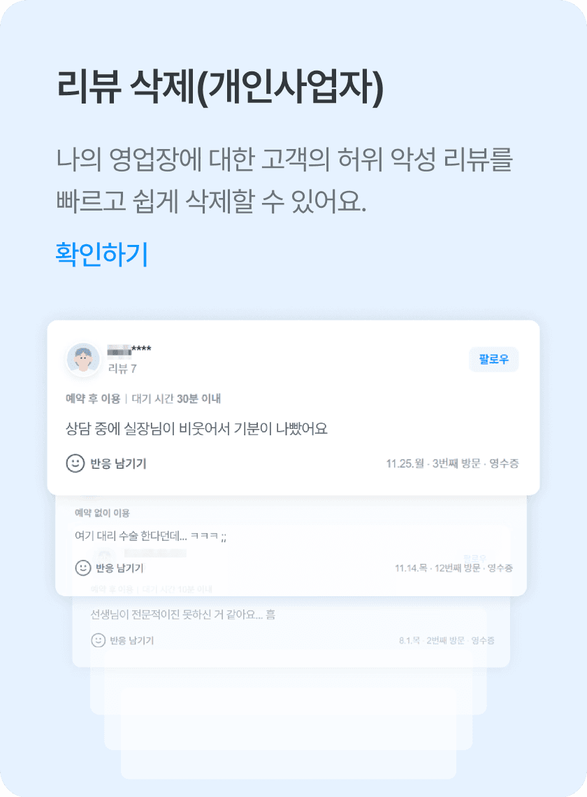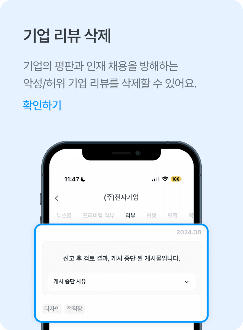 악성 기업 리뷰로 인한 채용 부진 및 기업의 명예를 훼손하는 허위 리뷰를 삭제할 수 있습니다.