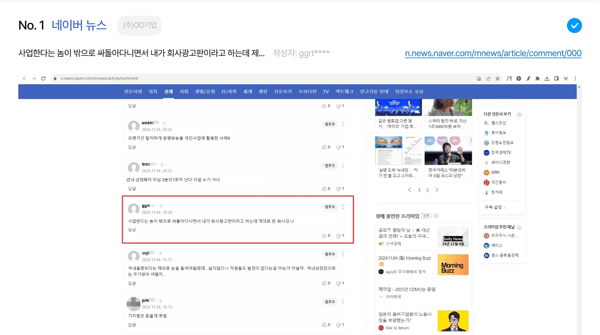 기업 및 경영진에 대한 부정적인 내용, 허위 사실 등 루머를 유포하는 게시물을 모니터링하고 삭제할 수 있습니다.